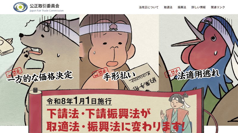 公正取引委員会は、令和8年1月1日施行の「中小受託取引適正化法」(通称「取適法」=改正下請法)の周知を図る特設サイトを開設しました。
